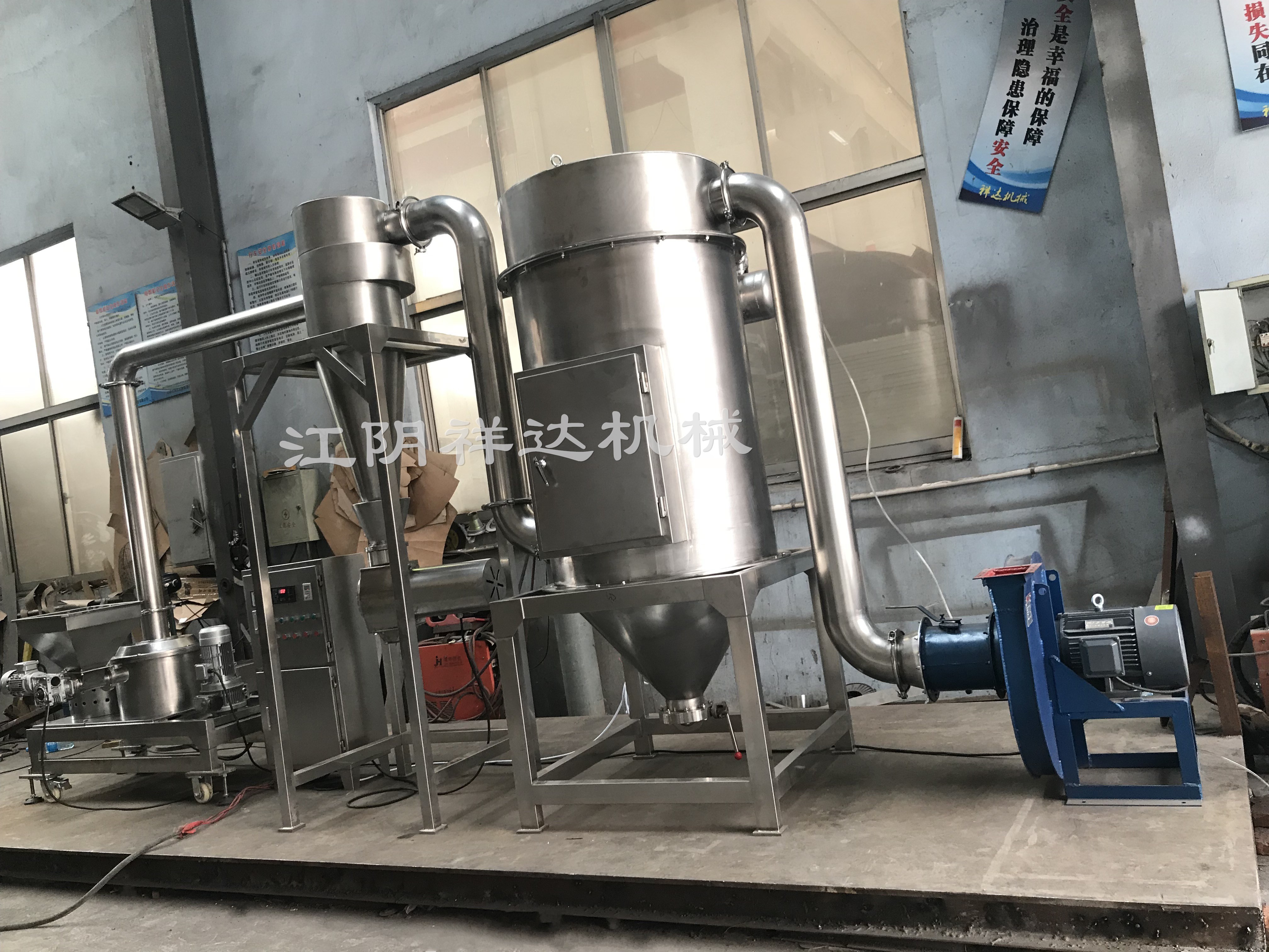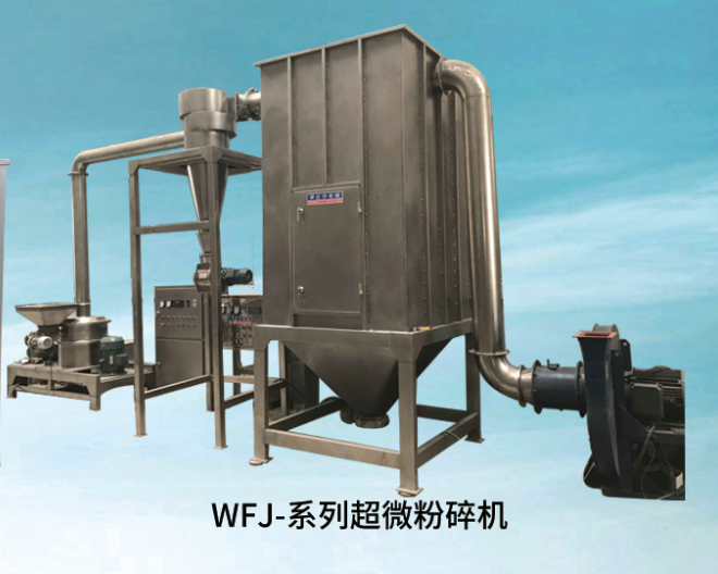 WFJ-超微粉碎机由主机、辅机、电控箱三个部分组成,具有风选式、无筛、无网、粒度大小均匀等多种性能,生产过程连续进行。该机在粉碎作业时主机不升温,可粉碎各种热敏性物料。其综合性能已达到国际先进水平,该机广泛运用于制药、化工、食品 (例:中药. 食品.化工.保健.根类. 径类.玉米、大米、辣椒、胡椒、油麦、大豆、大蒜、八角、桂皮、脱水蔬菜、山楂、干姜、蒜片、白糖. 糖精. 粮食类、虾皮、南瓜粉、调料)等工业的物料粉碎。